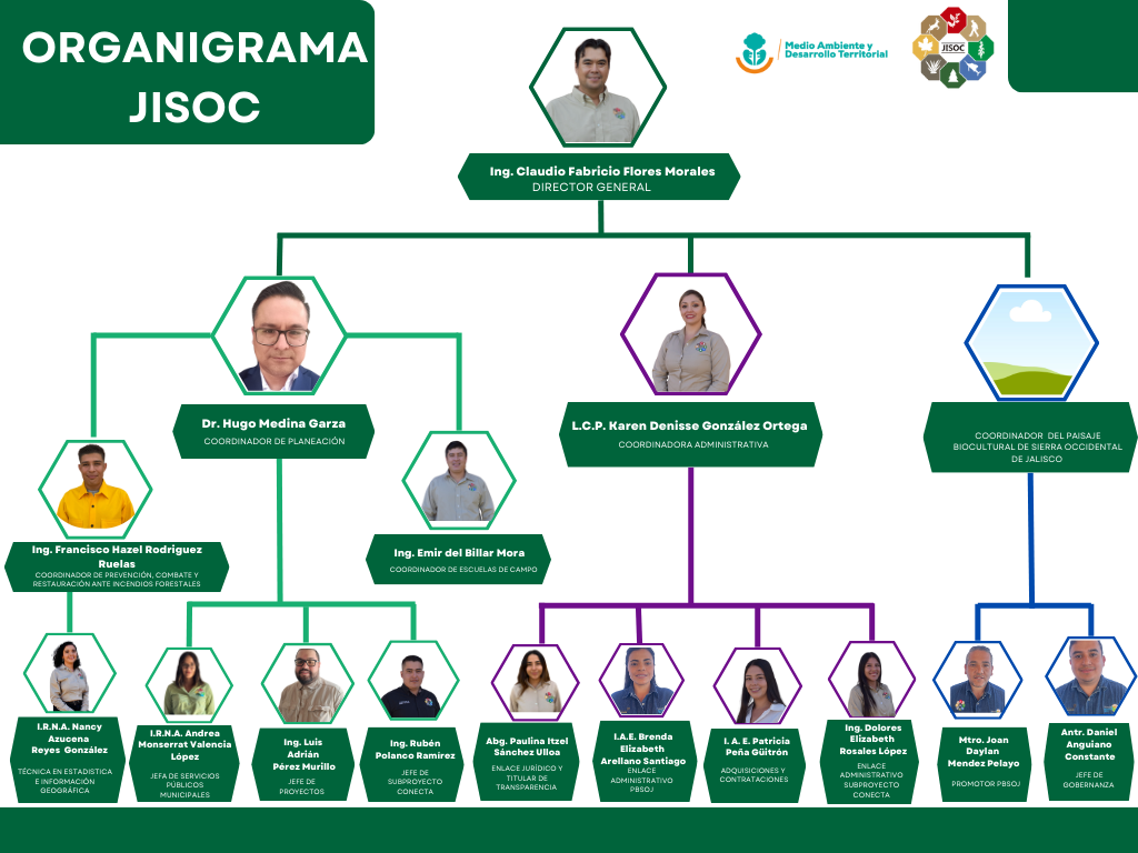 La JISOC cuenta con un órgano máximo de gobierno integrado por los 8 presidentes municipales, un representante de la CONAFOR, CONANP, SADER, SEMADET, UNIVERSIDAD DE GUADALAJARA y un Consejo de Participación Ciudadana y a su vez, un organigrama interno constituido por la Dirección general, Coordinación de Planeación, Coordinación Administrativa, Jefatura de Proyectos y personal externo que sea considerado para los fines de la intermunicipalidad.