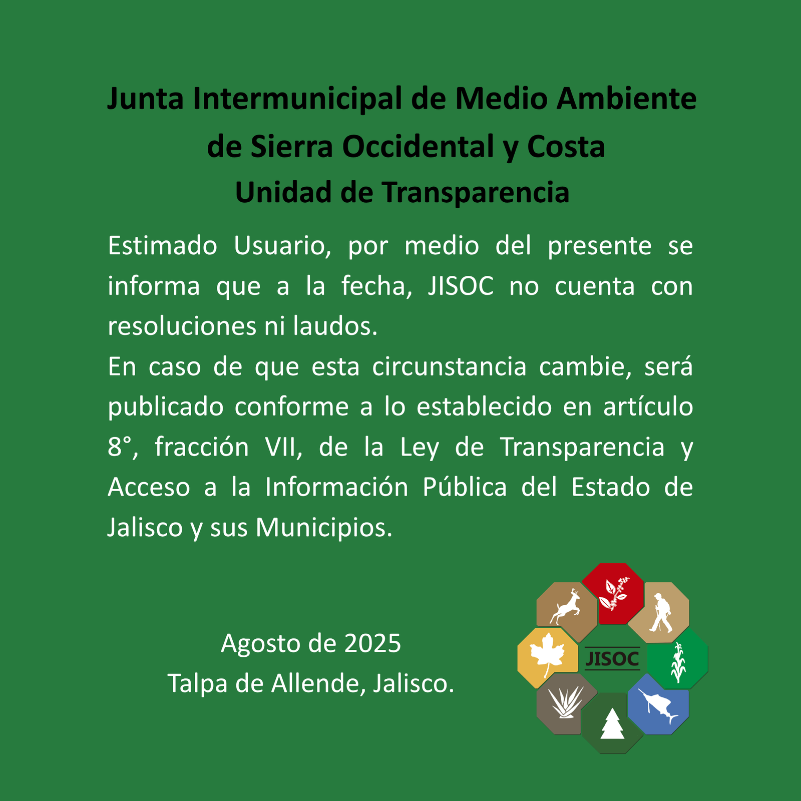 La Junta Intermunicipal de Medio Ambiente de Sierra Occidental y Costa, a través de su Unidad de Transparencia pone a su disposición la información pública que se genera cumpliendo así, con la atribución establecida en la Ley de Transparencia y Acceso a la Información Pública del Estado de Jalisco y sus Municipios en su artículo 8, con el compromiso de garantizar el derecho fundamental de acceder a la información, optimizando los mecanismos para consultar y solicitar información pública.